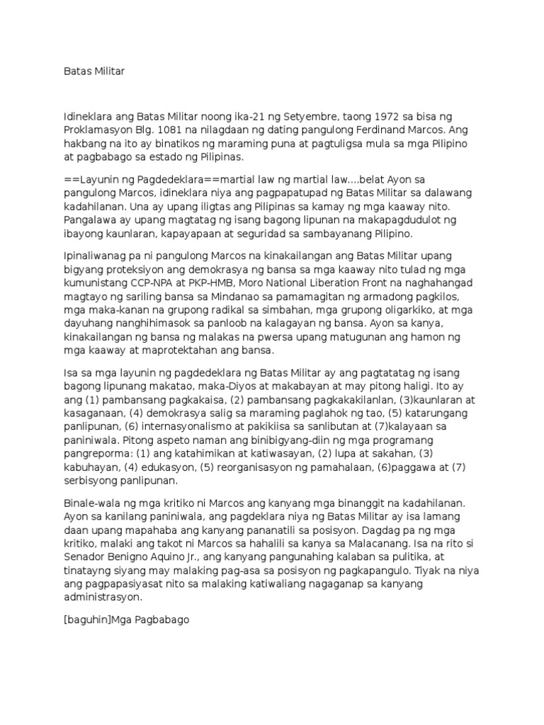 Halinat siyasatin natin kung ano ba ang nangyari sa Pilipinas sa. 23 Setyembre 1972 ay idineklara ni Ferdinand Marcos ang Batas Militar o Martial Law at binuwag ang Kongreso ng Pilipinas na nag-aalis ng tungkulin sa mga senador at kinatawan. Bilang isang Filipino na ipinanganak ilang taon matapos ang martial law masasabi kong isa itong paraan ng administrasyon noong mga panahon na yon upang kontrolin ang taong bayan.