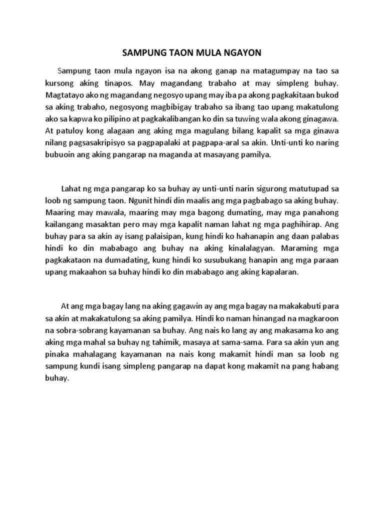 Sanaysay Sampung Taon Mula Ngayon Paano Mo Nakikita Ang Iyong Sarili After 10 Years Brainly Ph