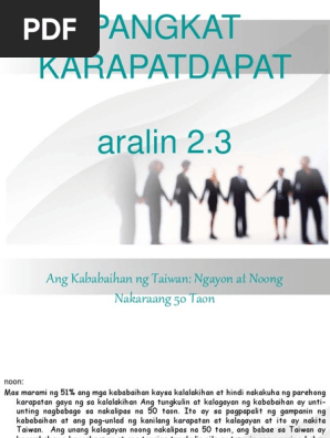 Cathy MolinaD Vilma C. Maaaring isipin ng ilan na ang kababaihan ay nakakukuha ng parehong pagkakataon at karapatan gaya ng kalalakihan. 1 on a question Ang kababaihan ng Taiwan.
