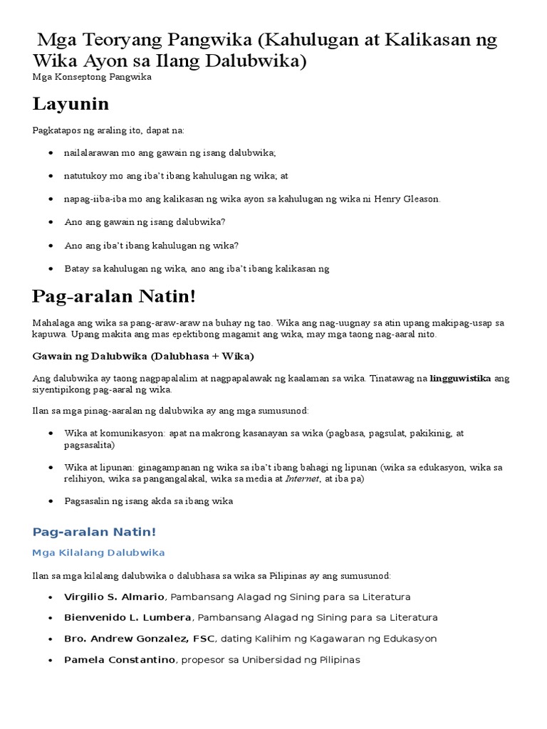 Ang taong maituturing na dalubwika ay maaaring isang linguist o. Isa na rito ayang pagpapakahulugan na ang wika ay isang masistemang balangkas na sinasalitang tunog na binibigyan ng mga simbolo at hinuhusgisan ng mga letra upang makabuo ng mga salitang pinagsama-sama tungo sa mga pangungusap na may buong. May ibat-ibang patimpalak isa na rito ang tula paggawa ng sanaysay mga sayaw at iba pa.