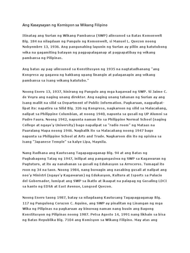 Ang Kasaysayan Ng Komisyon Sa Wikang Filipino
