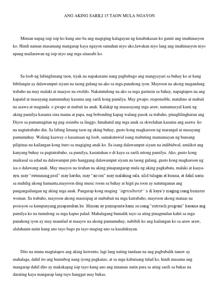 Answers answermalulungkot ka maboboring ka Sumulat ng liham para sa sarili sampung taon mula ngayon. Wala ka ng alam masyado other than your thesis or kung ano man ang nasa labas ng eskwelahan mo. Since inception we have amassed top talent Sino Ako Sampung Taon Mula Ngayon Essay through rigorous recruiting process in addition to using sophisticated design and tools in order to deliver the best results.