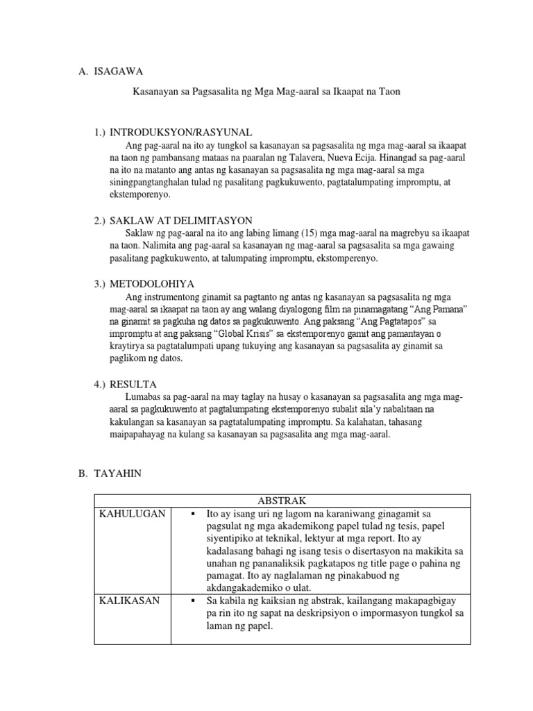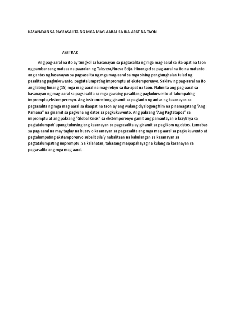 Kasanayan sa Pagsasalita ng Mga Mag-Aaral sa Ikaapat na Taon AbstrakAng pag-aaral na ito ay tungkol sa kasanayan sa pagsasalita ng mga mag-aaralsa ika-apat na taon ng pambansang mataas na paaralan ng Talevera Nueva EcijaHinangad sa pag-aaral na ito na matanto ang antas ng kasanayan sa pagsasalita ng mgamag-aaral sa mga sining pangtanghalan tulad ng. Hinangad sa pag-aaral na ito na matanto ang antas ng kasanayan sa pagsasalita ng mgamag-aaral sa mga. Ang paksang Ang Pagtatapos sa impromptu at ang paksang Global Krisis sa ekstemporenyo gamit ang pamantayan o kraytirya sa pagtatalumpati upang tukuying ang kasanayan sa pagsasalita ay ginamit sa paglikom ng datosLumabas sa pag-aaral na may taglay na husay o kasanayan sa pagsasalita ang mga mag-aaral sa pagkukuwento at.